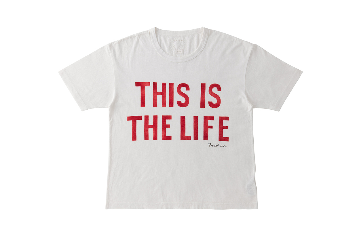The words 'THIS IS THE LIFE' are reproduced by hand-dyeing from the original hand-drawn and hand-cut stencil. The stenciled letters each have a different balance and thickness, giving them a warmth not found in uniformly flat font produced by digital software.